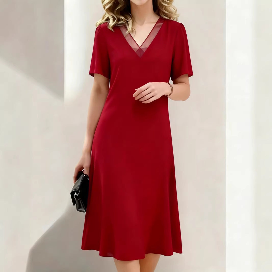 This V-neck midi dress features a streamlined silhouette with short sleeves and a softly flared hem. The structured neckline detail adds a refined touch while the flowing shape allows natural movement for everyday or occasion wear.